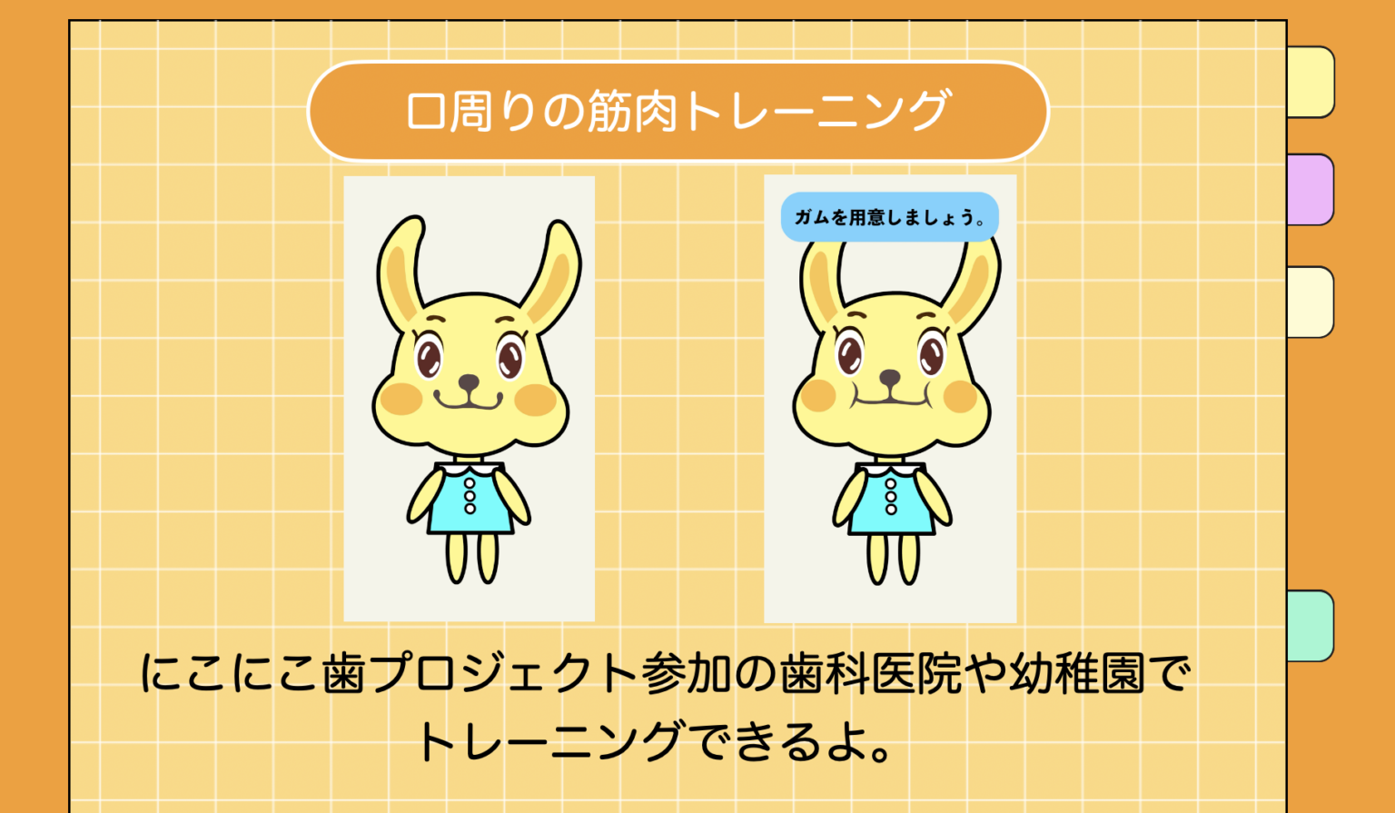 にこにこ歯プロジェクトでは、お子さんの成長に合わせた「ベロトレ」や「口育(こういく)」の指導も行っています。